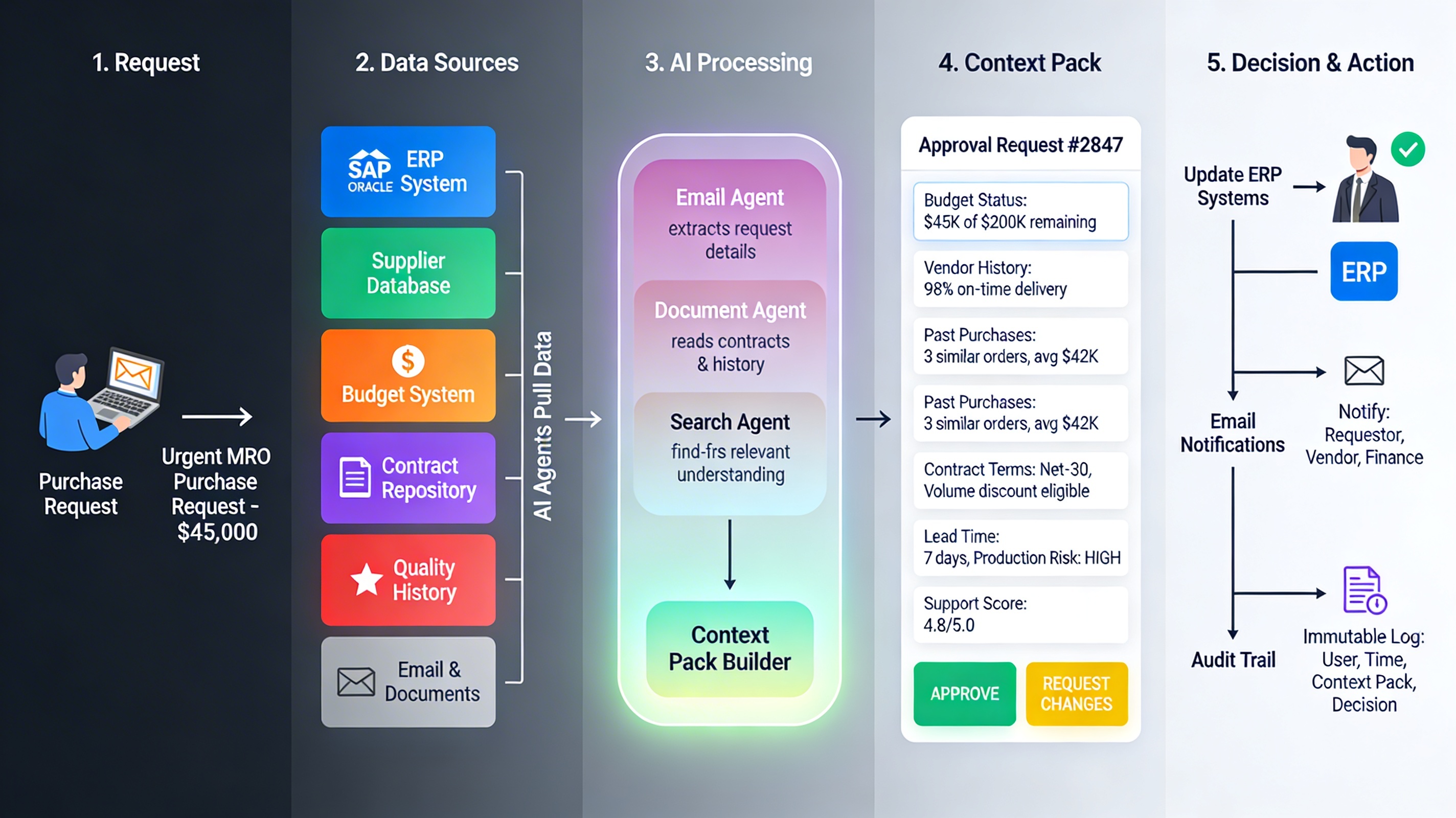 ERPs record what happened. They were not built for decisions. They cannot pull context, route to approvers, or produce a brief.